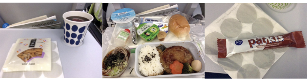 機内で出されたもので、時系列的には左から10時のおやつ、昼食、15時のおやつとなります。