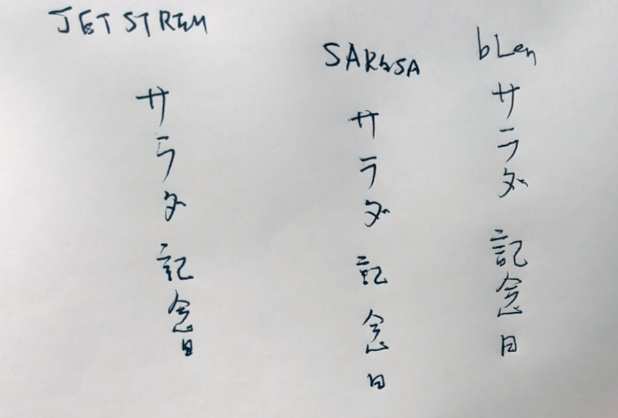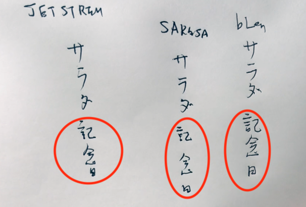 管理人は左手側から順番に、それぞれのペンで”記念日”を書きましたが、一番、見やすいのはbLenです。
